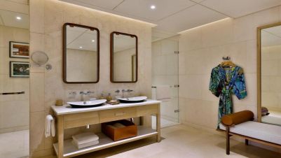 Едноспален апартамент с гледка към океана: С площ 94 кв. м. и капацитет до 3 възрастни. Стаята е оборудвана със спалня, стилна всекидневна с маса за хранене и разтегателен диван, тераса с кушетка. Тази стая се намира на брега на морето и разполага с голяма тераса с кушетка, всекидневна с маса за хранене и личен бар. Специалните удобства включват безплатен Wi-Fi, удобства за приготвяне на кафе / чай и баня.
