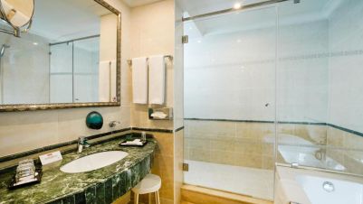 баня с душ или вана, сешоар, тоалетни принадлежности