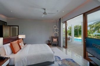 Луксозни вили с просторна спалня, собствена тераса и гледка към океана, идеални за спокойна почивка с всички удобства.