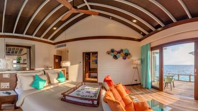 Вълшебните водни вили, идеални за романтично бягство или мечтан меден месец на Малдивите, се простират покрай кристално чиста лагуна. За 2 възрастни и 2 деца или 3 възрастни и 1 дете, с 1 легло King, площ 103 м².