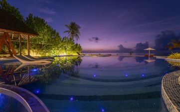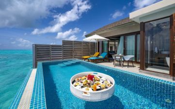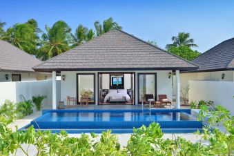 Изживейте перфектната комбинация от островен чар и съвременен комфорт в уединени вили с морска гледка на Малдивите. За 2 възрастни и 2 деца или 3 възрастни и 1 дете, с 1 легло King, площ 146 м², басейн 30 м².