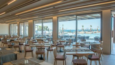 На територията на хотела: Хотелът разполага с два ресторанта (основен ресторант (сервира се на шведска маса) и гръцки ресторант а-ла-карт) и два бара, плувен басейн и басейни тип лагуна, воден парк с кът за отдих и уелнес център с успокояващ спа център и напълно оборудвана фитнес зала гарантират почивка. Разполага и с 24-часово обслужване на рецепция, паркинг.