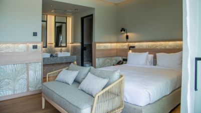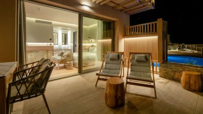 В стаите: Стаите са оборудвани с всички удобства. Предлагайки стаи с изглед към морето и частен басейн, луксозни апартаменти с частни външни джакузита, както и просторни стаи и апартаменти за семейства. Стаите са оборудвани с телевизор с плосък екран със сателитни канали, хладилник, сешоар и тоалетни принадлежности, както и с високоскоростен Wi-Fi интернет. Гостите могат да направят своя избор от стаи с изглед към градината или морето, частен басейн или външно джакузи и да се насладят на престой в Крит.